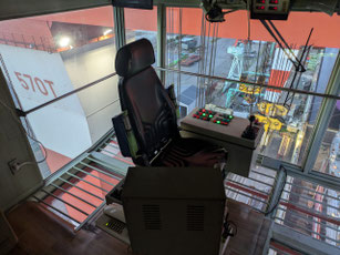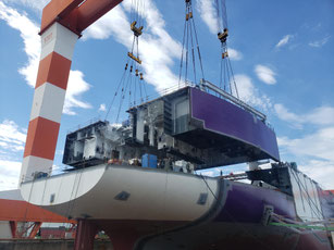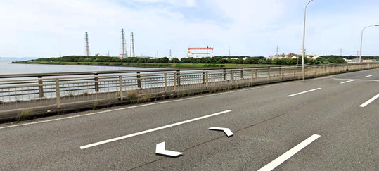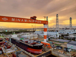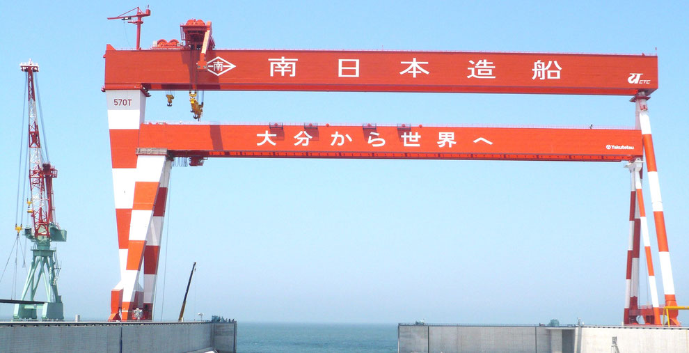 海側に赤白の巨大な構造物が見られます。 造船所のシンボルでもある県内最大のゴライアスクレーンです。